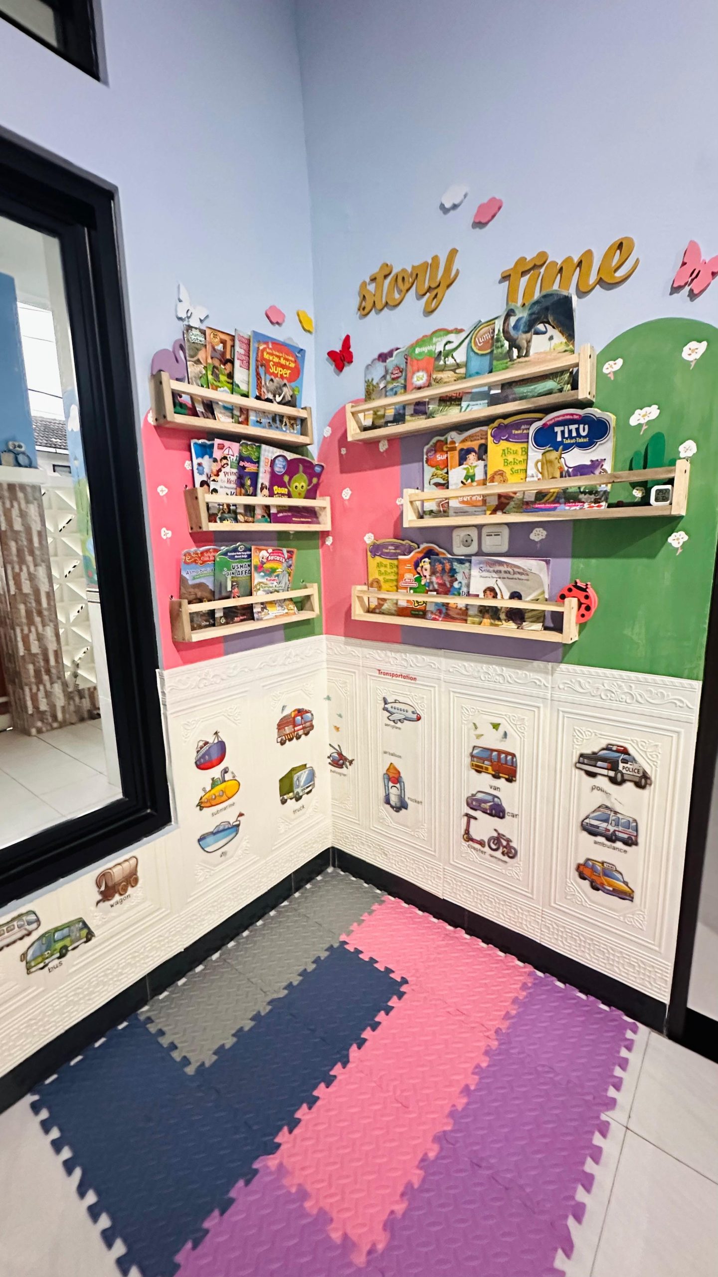 Permainan edukatif dilengkapi dengan Pojok Baca menjadi tempat ternyaman saat pembelajaran dan hiburan.